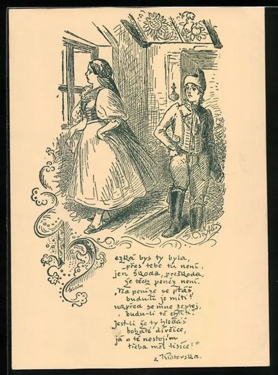 Künstler-AK sign. M. Ales: Frau in Tracht steht am Fenster und beachtet den Mann nicht