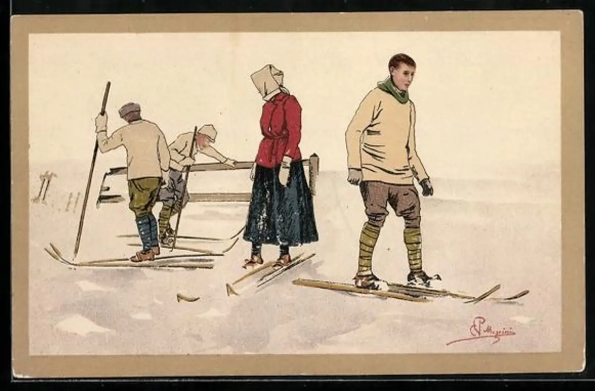 Künstler-AK sign. Pellegrini: Leute auf Skiern stehen im Schnee
