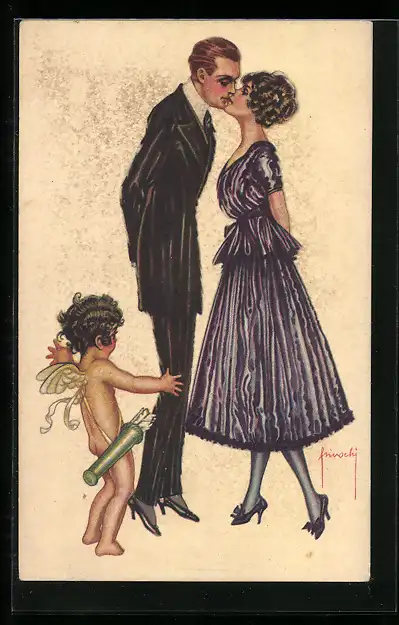 Künstler-AK sign. Pinochi: Ein Liebespaar beim Kuss, Amor daneben