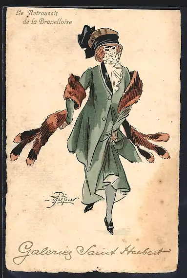 Künstler-AK sign. Préjelan, Galeries Saint Hubert, Le Retroussis de la Bruxelloise