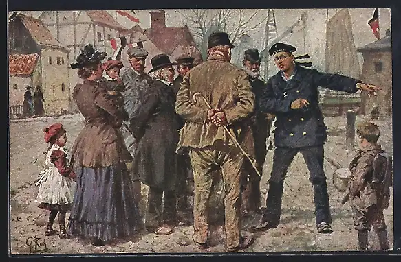 Künstler-AK sign. Prof. G. Koch: Matrose spricht angeregt mit Bürgern