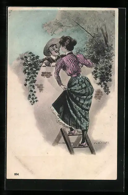 Künstler-AK sign. R. v. Rüdiger: Techtelmechtel an der Gartenmauer