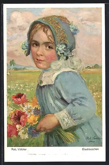 Künstler-AK sign. Rob. Völcker: Blauhäubchen, Mädchen mit blauer Haube und Blumen