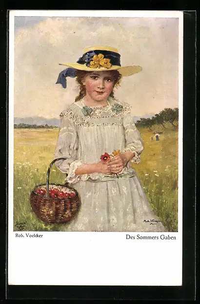 Künstler-AK sign. Rob. Voelcker: Mädchen mit Korb voller Kirschen