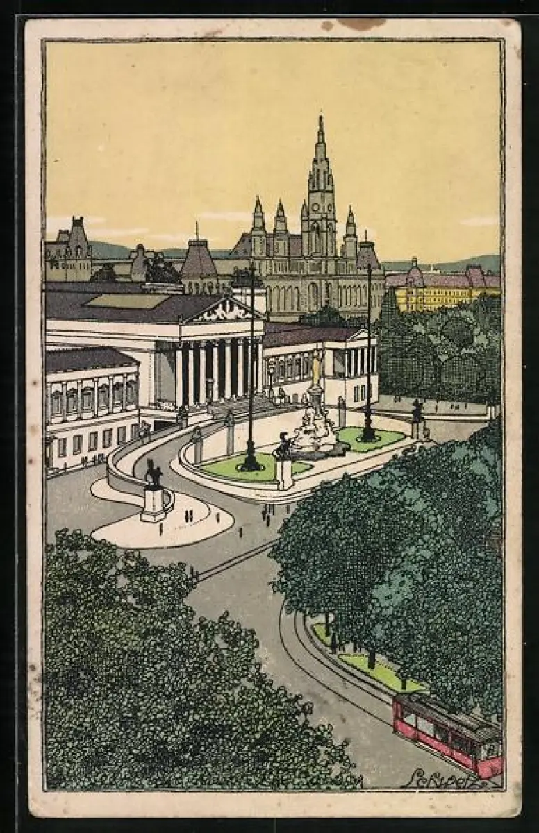 Künstler-AK sign. Schwetz: Jugendstil-Monumente mit Passanten und Strassenbahn - Kilophot. Nr. 122