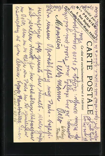 Personenbezogene Daten auf der Rückseite der Karte wurden durch blauen Textmarker unkenntlich gemacht. Die blauen Stellen sind auf die Vorderseite durchgeweicht und wirken sich negativ auf das Postkartenfoto aus