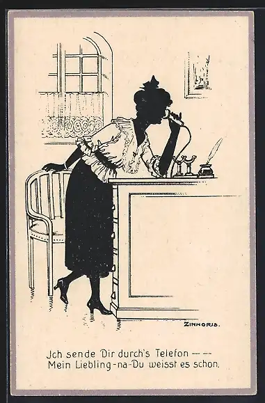 Künstler-AK sign.:Zinnoris, Ich sende dir durchs Telefon... Frau am Hörer