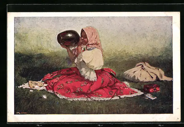 Künstler-AK tschechische Pilgerin rastet auf einer Wiese