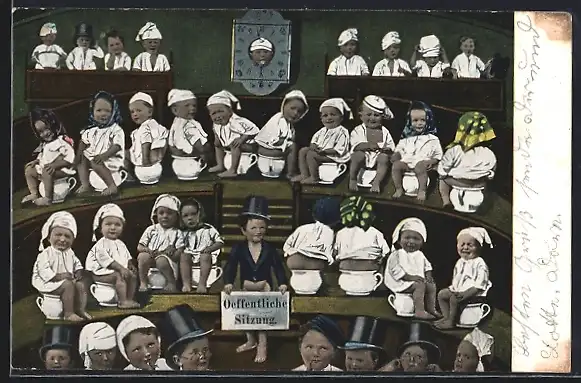 Künstler-AK viele Kinder auf Nachttopf sitzend im Parlament, Öffentliche Sitzung