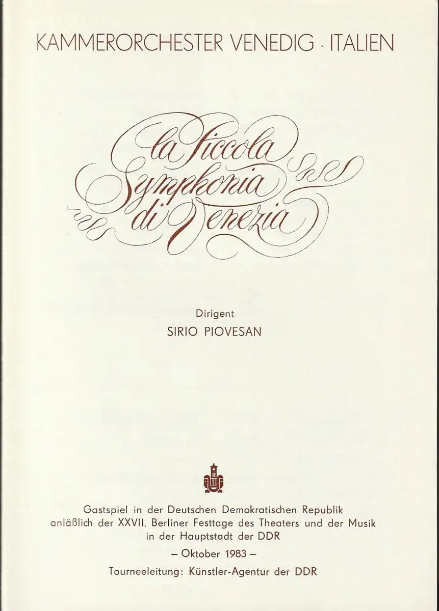Künstler-Agentur der DDR: Programmheft KAMMERORCHESTER VENEDIG LA PICCOLA SYMPHONIA DI VENEZIA Oktober 1983 Komische Oper XXVII Berliner Festtage des Theaters und der Musik.