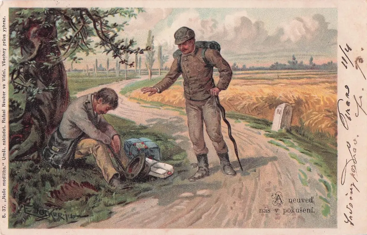 Künstler-Ansichtskarte E. Döcker: Erschöpfter Wanderer an einen Baum gelehnt -798640