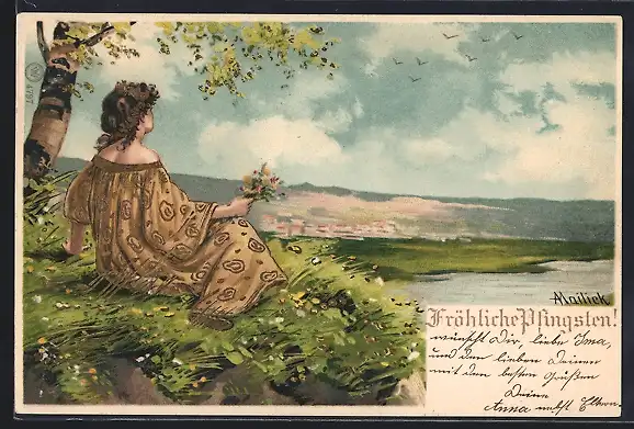 Künstler-Lithographie Alfred Mailick: Fröhliche Pfingsten, Dame sitzt auf der Wiese