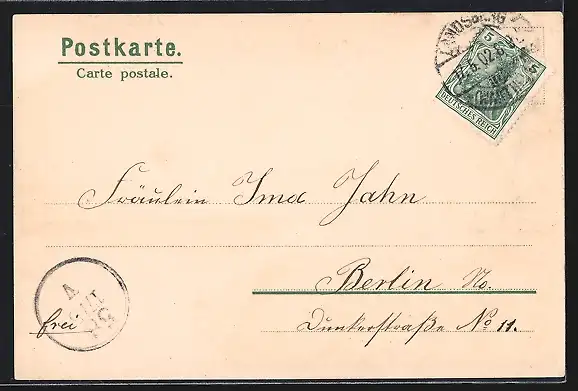 Personenbezogene Daten auf der Rückseite der Karte wurden durch blauen Textmarker unkenntlich gemacht. Die blauen Stellen sind auf die Vorderseite durchgeweicht und wirken sich negativ auf das Postkartenfoto aus
