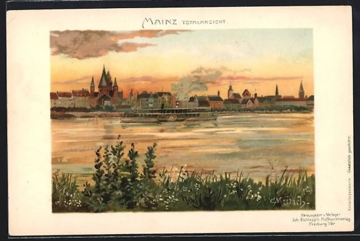 Künstler-Lithographie Carl Münch: Mainz, Totalansicht
