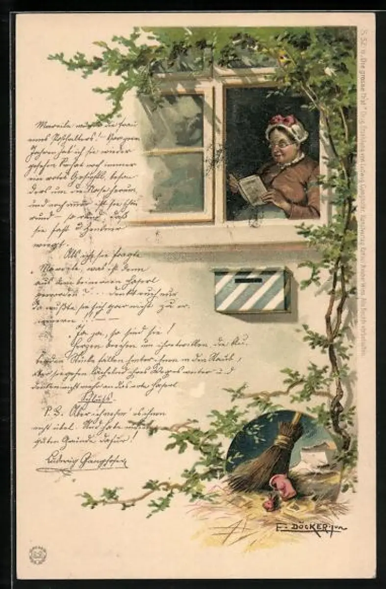 Künstler-Lithographie E. Döcker: Die grosse That, am Fenster lesende Greisin