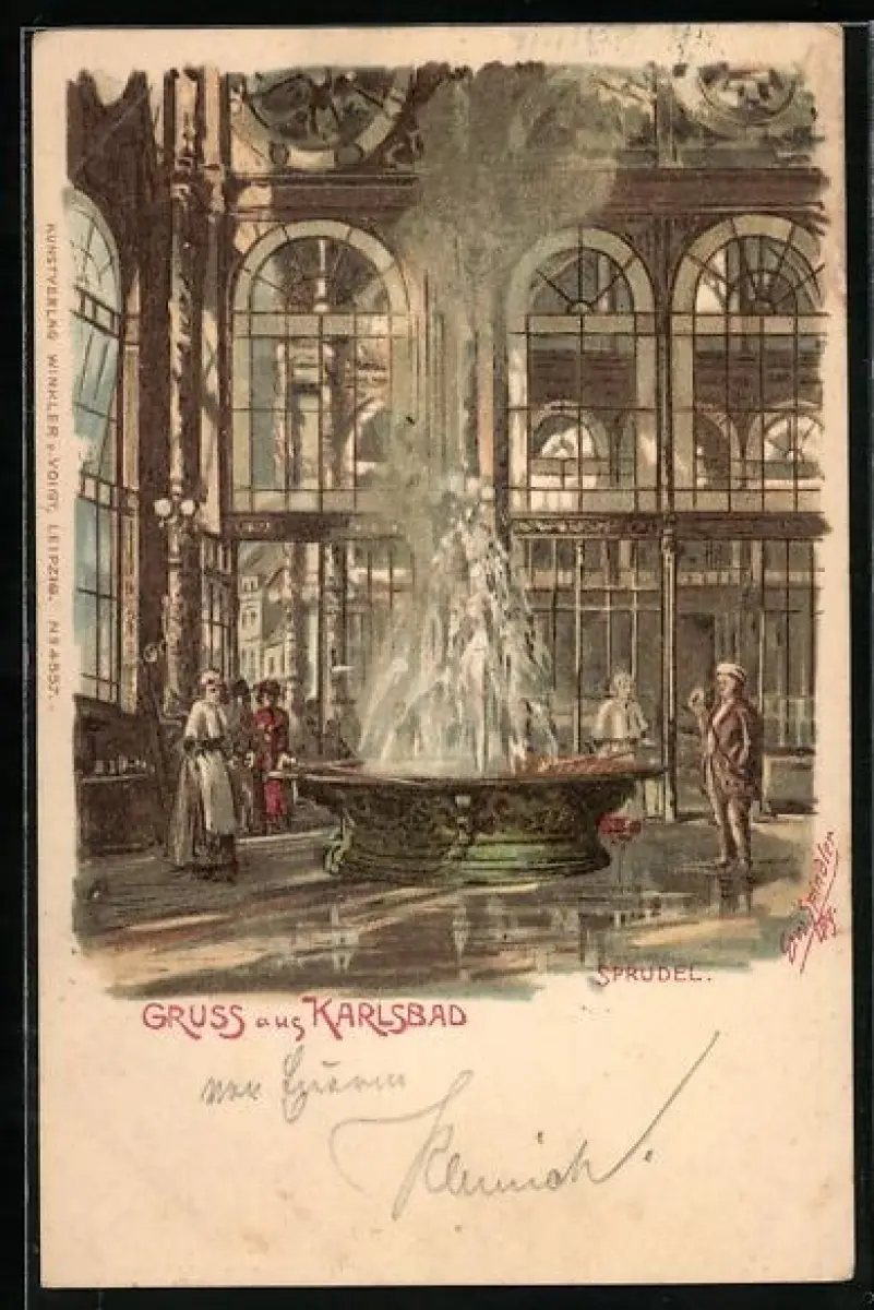Künstler-Lithographie Erwin Spindler: Karlsbad, Ansicht eines Sprudels