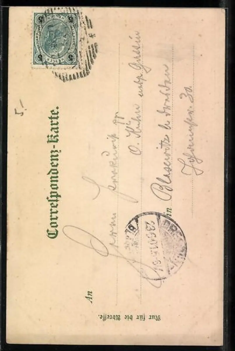 Personenbezogene Daten auf der Rückseite der Karte wurden durch blauen Textmarker unkenntlich gemacht. Die blauen Stellen sind auf die Vorderseite durchgeweicht und wirken sich negativ auf das Postkartenfoto aus