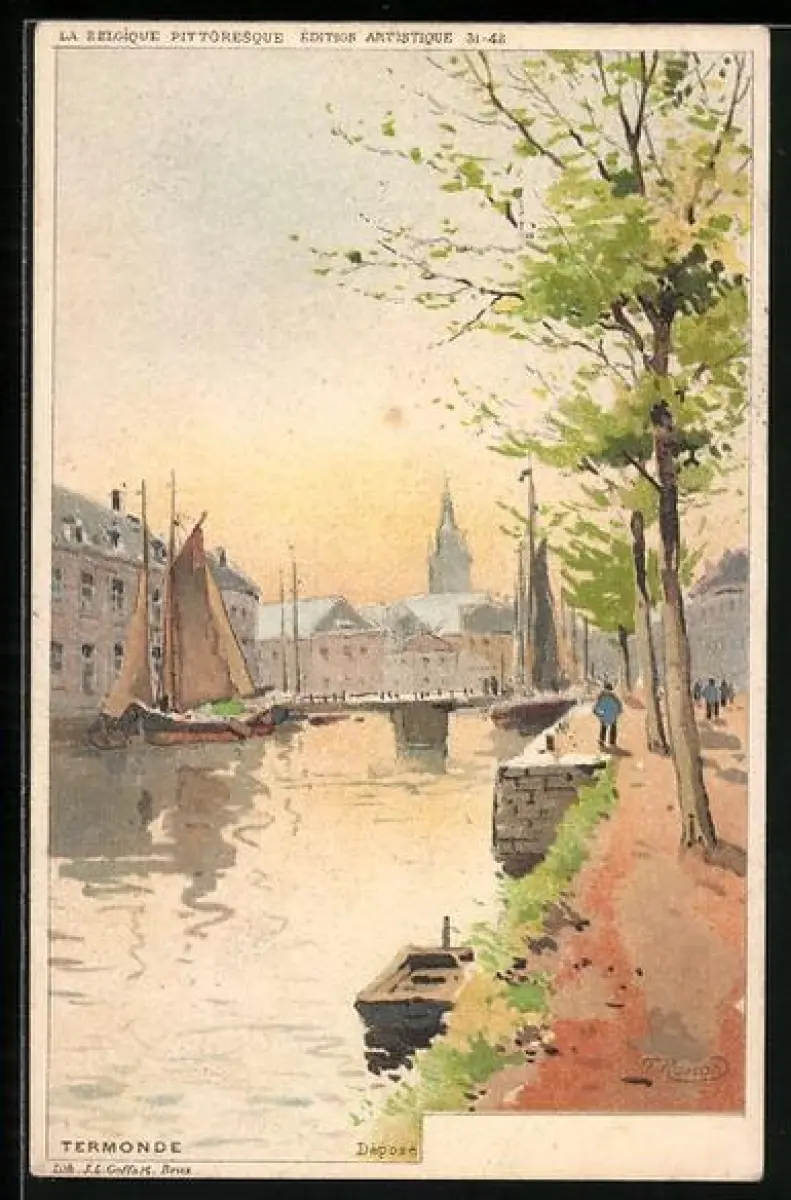 Künstler-Lithographie F. Ranot: La Belgige Pittoresque - Termonde, Partie am Wasser