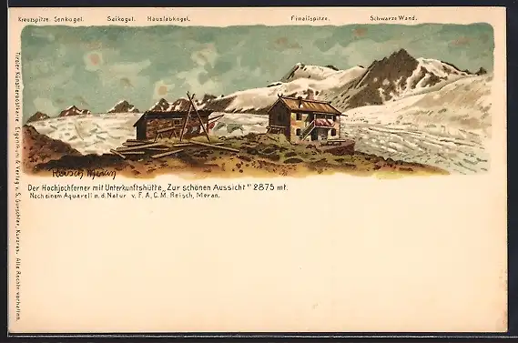Künstler-Lithographie F.A.C.M. Reisch: Unterkunftshütte zur schönen Aussicht, Berghütte am Hochjochferner mit Saikogel