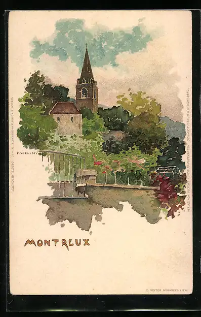 Künstler-Lithographie Fritz Voellmy: Montreux, Kirche