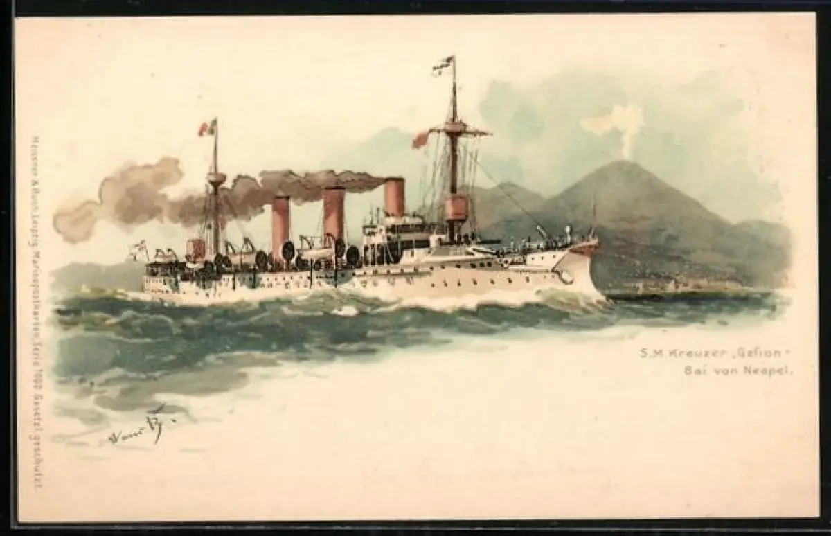 Künstler-Lithographie Hans Bohrdt: Kreuzer Gefion in der Bucht von Neapel