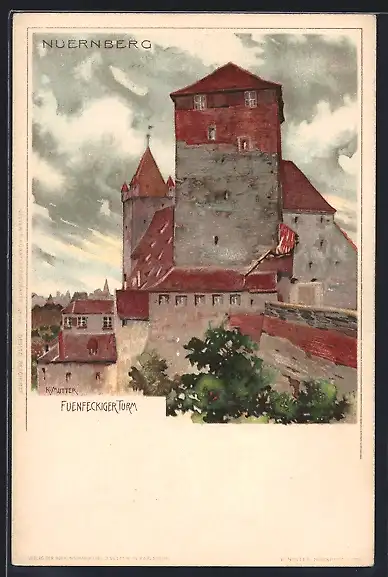Künstler-Lithographie Karl Mutter: Nürnberg, Fünfeckiger Turm aus der Vogelschau