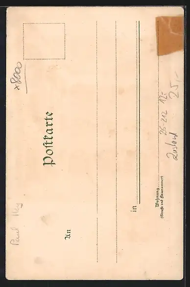 Personenbezogene Daten auf der Rückseite der Karte wurden durch blauen Textmarker unkenntlich gemacht. Die blauen Stellen sind auf die Vorderseite durchgeweicht und wirken sich negativ auf das Postkartenfoto aus