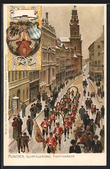 Künstler-Lithographie Paul Hey: München, Schäfflertanz in der Theatinerstrasse