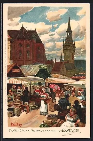Künstler-Lithographie Paul Hey: München, buntes Marktleben auf dem Victualienmarkt