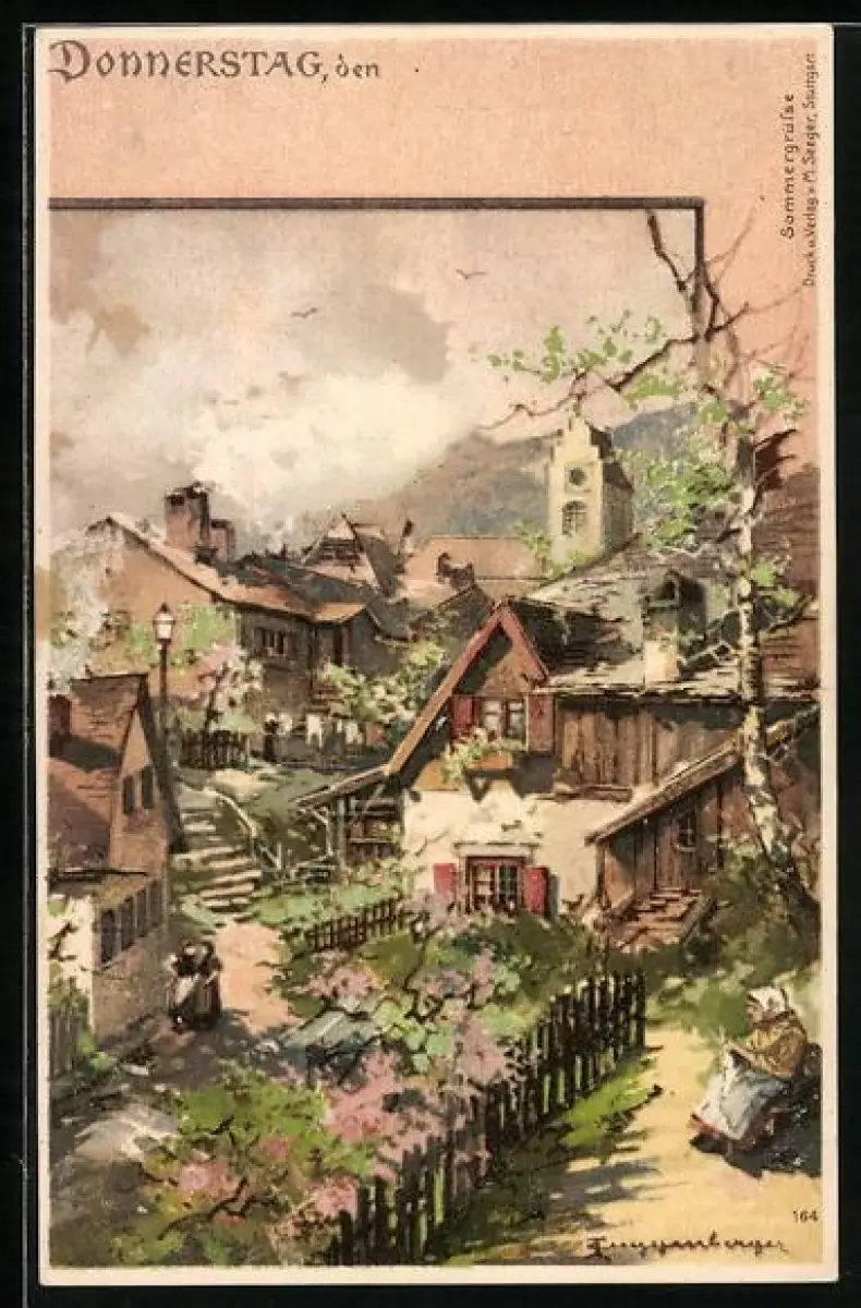 Künstler-Lithographie Theodor Guggenberger: Jeudi, le..., Ortspartie im Frühling