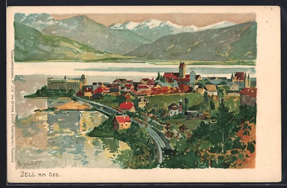 Künstler-Lithographie Zell am See, Panorama mit Gebirge