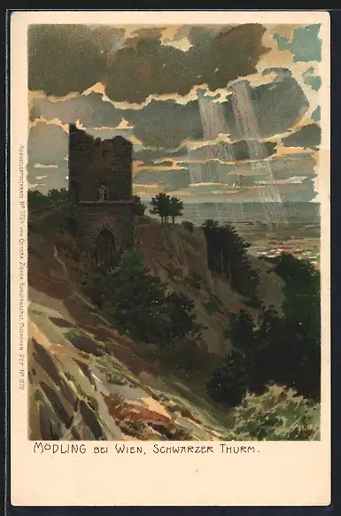 Künstler-Lithographie unsign. Paul Hey: Mödling bei Wien, Schwarzer Turm