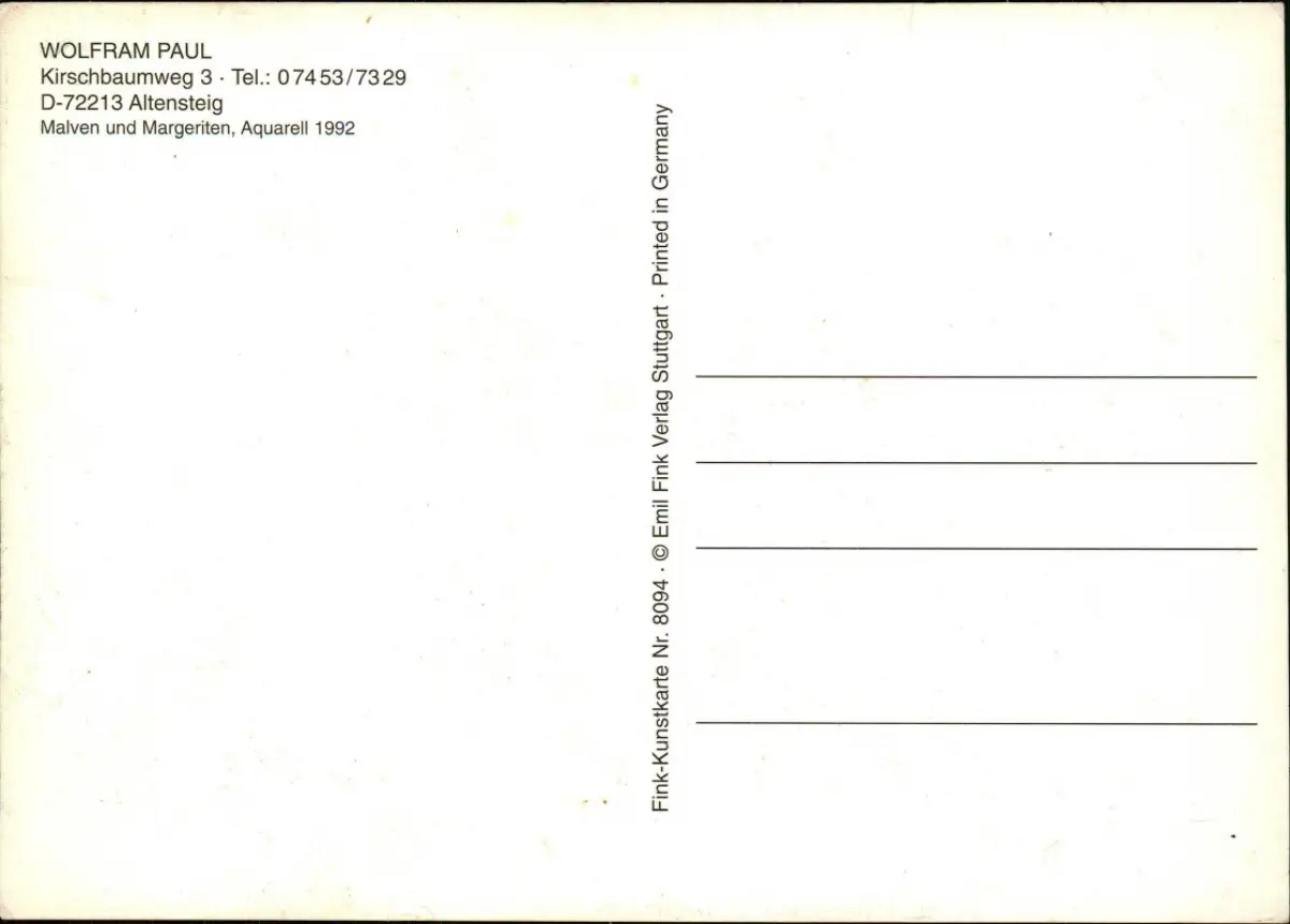 Name: Künstlerkarte WOLFRAM PAUL Malven und Margeriten, Aquarell 1992
