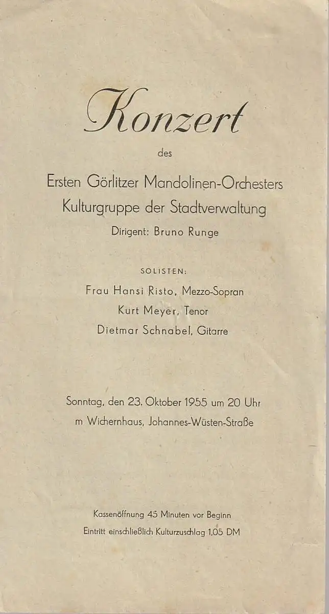 Titel: Programmheft KONZERT DES ERSTEN GÖRLITZER MANDOLINEN-ORCHESTERS 23. Oktober 1955 WICHERNHAUS