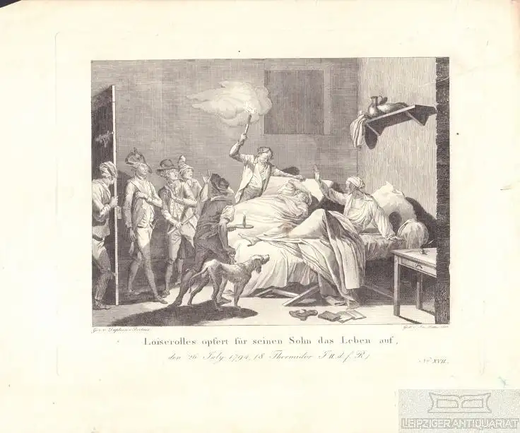 Bemerkungen: Zustand: Blatt leicht fleckig und altersbedingt minimal gebräunt, Radierung gebräunt, Ecken wenig bestoßen // Unter rechts mit XVII. nummeriert. Kunstgrafik. Druckgröße: 20 x 15 cm, Joseph Hutter nach zeitgenössischer Zeichnung von Jean Duplessi-Bertaux (1747?1819) am 6. Juli 1794 Jean-Simon Loizerolles (1732?1794) und Sohn François-Simon (1772?1845), Französische Revolution: Diktatur Robespierres 1794