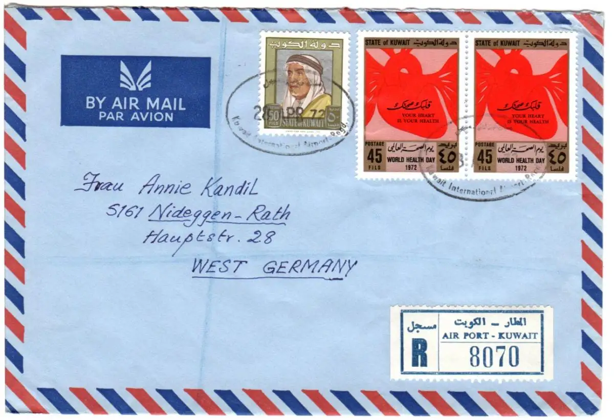 Kuwait 1972, 50+2x45 F. World Health Day auf Luftpost Reko Brief n. Deutschland