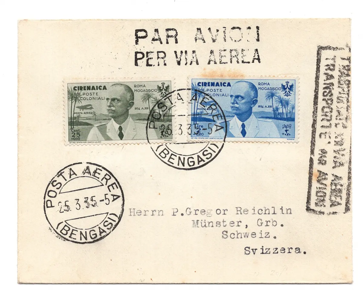 Briefumschlag - Kyrenaika - Luftpost Nr. 30 + 35 zwei Werte der Serie Flug Rom - Mogadischu auf Luftumschlag von Bengasi in die Schweiz am 25.3.35, auf der Vorderseite Stornierung im zweisprachigen Ordner Transported Per Aerea auf der Rückseite Ankunftsstornierung Schweiz 2.4.35 - Vergilbungsfleck auf einer Briefmarke Cod. 2748/WEB