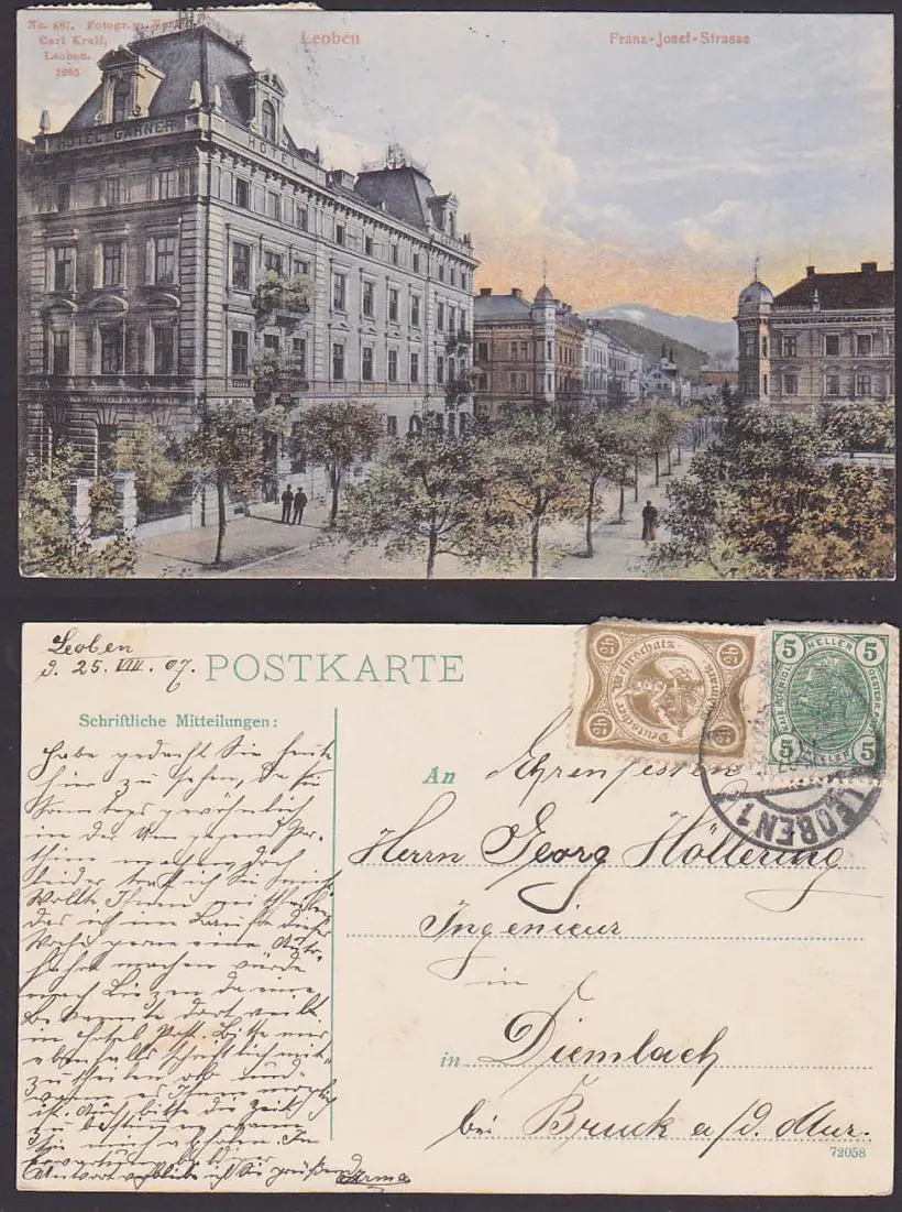 LEOBEN Ak Franz-Josef-Str. 1907 2 Heller Spendenmarke Deutscher Wehrmacht Südmark mit 5 H. frankiert