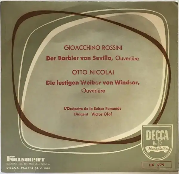 7" Single L'Orchestre De La Suisse Romande - Der Barbier Von Sevilla / Die Lustigen Weiber Von Windsor Ouvertüre, Zustand Platte VG Hülle VG; Made in Germany 1955 Decca DX 1779, Tracks Rossini - Der Barbier Von Sevilla: Ouvertüre, Otto Nicolai - Die Lustigen Weiber Von Windsor: Ouvertüre