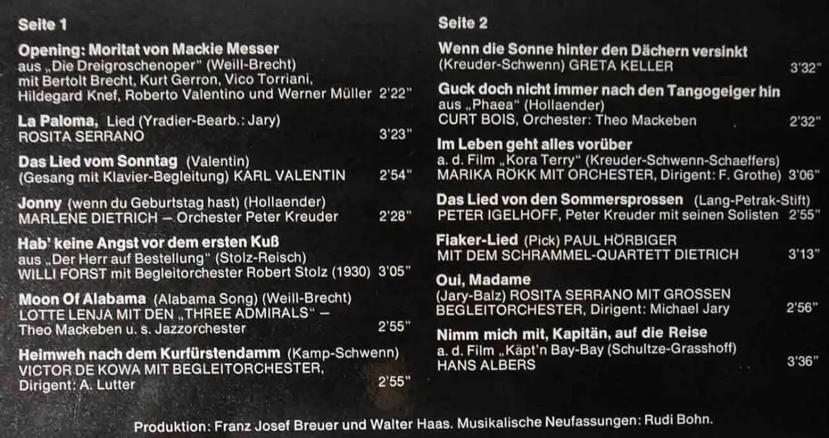 Stars von damals in Stereo - u.a. mit Hildegard Knef, Marlene Dietrich, Karl Valentin, Rosita Serrano, Victor de Kowa, Willi Forst, Greta Keller, Curt Bois, Peter Igelhoff, Paul Hörbiger usw...