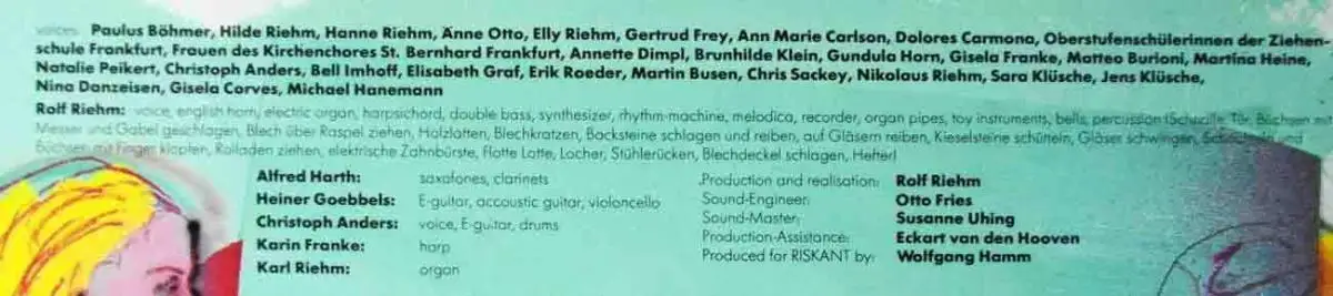 Originalalbum, Riskant Records, dt. Pressung, 1982, WDR Produktion / Rolf Riehm, mit Paulus Böhmer, Hilde Riehm u.v.a.; Musik: Heiner Goebbels, Alfred Harth, Rolf Riehm u.a.-