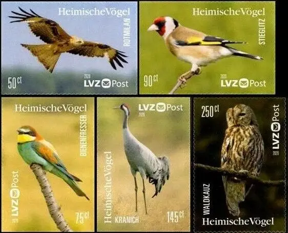 • MichSeite LVZ: MiNr. 570 I - 574 I, 02.01.2020, "Heimische Vögel", Satz, postfrisch Beschreibung \nPostdienstleister: LVZ, Leipzig \nAusgabeanlass: Briefmarkenausgabe "Heimische Vögel: Rotmilan, Bienenfresser, Stieglitz, Kranich, Waldkauz" Katalognummer: MiNr. 570 I - 574 I Ausgabedatum: 02.01.2020 Nominale: Satz (5 Werte) zu 0,50 EUR, 0,75 EUR, 0,90 EUR, 1,45 EUR, 2,50 EUR \nTyp: - \nErhaltung: selbstklebend, zähnungsartig gestanzt, postfrisch \nHinweis: - Thema: Tiere, Natur, Heimat, Wald, See