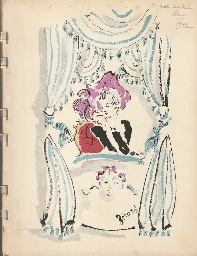 original Heft, gebunden mit 6 Kunststoffringen, nicht paginiert, ca. 46 Seiten + Blatt mit unbenutztem Los ( Losnummer 629 ) für die Tombola, Programmfolge, diverse Fotos und Illustrationen ( Illustrationen: Portrait Marechal Petain, JEAN COCTEAU 1944, Ray Bret Koch: LA LETTRE, Portrait M. Moreau, Jean-Paul Guiart: JOUEURS D'ECHECS Stalag 13 B, Lavallee: NOSTALGIE, Blanc Percier: CE SOIR, Portrait Amedee Bussiere, Jean-Paul Guiart: SA FORTUNE / SON REPAS QUOTIDIEN, Portrait Pierre Taittinger, Jean-Paul Guiart: POPOTE Stalag 13 B, Text in französischer Sprache. Zustand: gut-sehr gut, 2 Blatt aus den beiden unteren Kunststoffringen an der Lochkante eingerissen