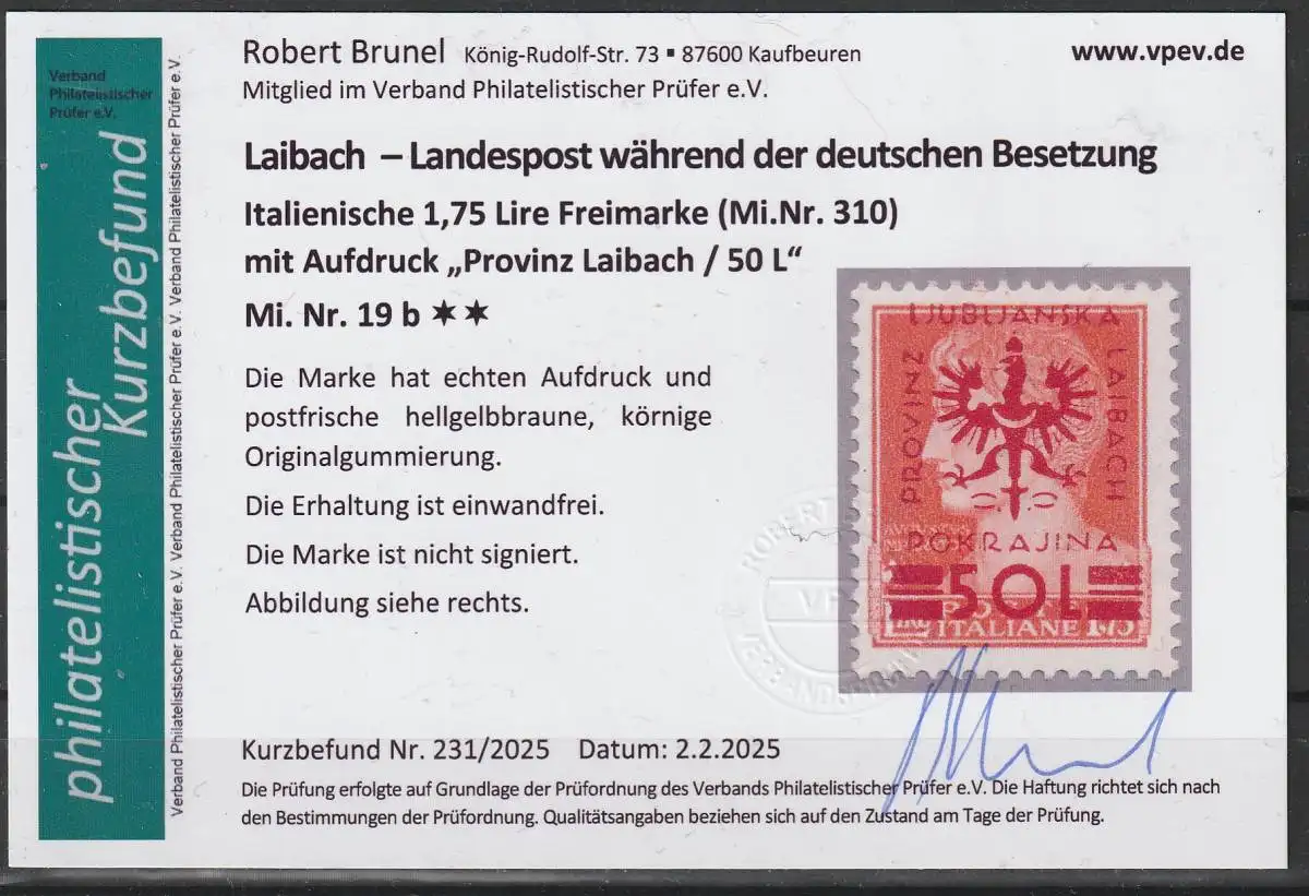 Laibach: Freimarke Nr. 19 in guter Farbe "b", **, Befund Brunel