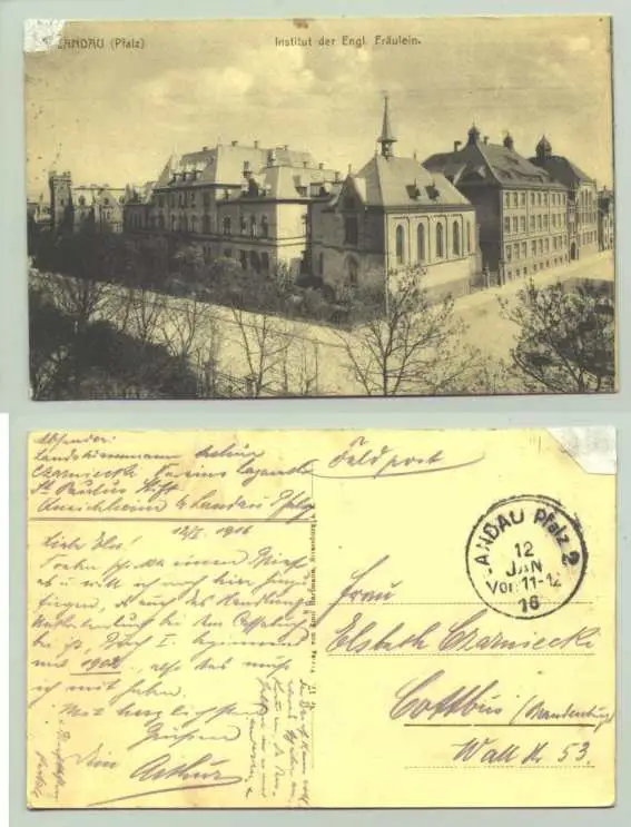 Landau 1916 (intern : 1009807) Artikelbeschreibung u. Zustand : Siehe Scan / links oben Ecke ab. Weitere Infos : Ansichtskarte. "Landau - Institut der Engl. Fraeulein". Mit Feldpost-Stempel Landau 12. Jan. 1916. Verlag Hartmann, Nr.17. PLZ-Bereich pauschal 76829