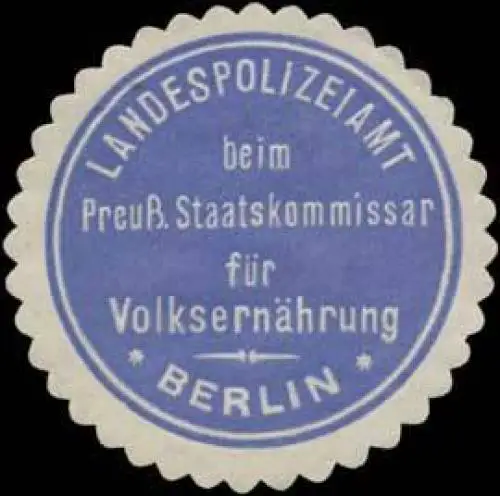 beim preuß. Staatskommissar für Volksernährung, LKA, blau, weiß, geprägt, Größe/Zustand: 4 , guter Zustand, Original Verschluss-Siegelmarke aus Papier welche früher von Behörden, Firmen etc. zum Versiegeln der Briefe benutzt wurden