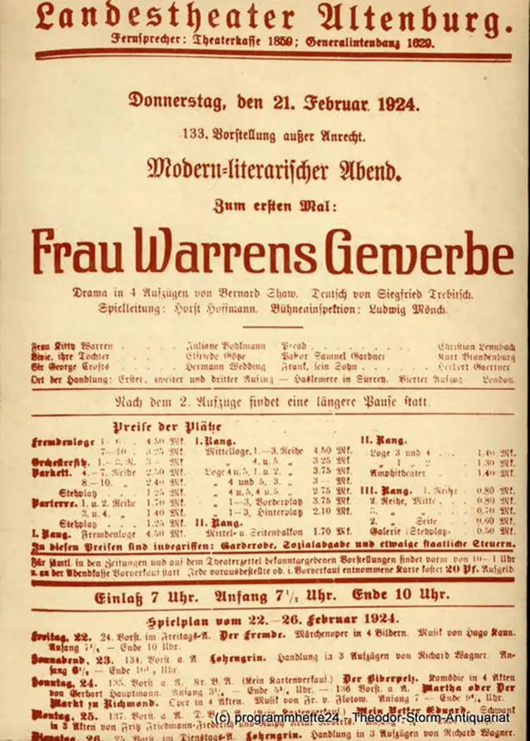 Mrs. Warren´s Profession. Ein unerfreuliches Stück in vier Akten von George Bernard Shaw. Neu ins Deutsche übertragen von Martin Walser. Inszenierung: Jürgen Kautz. Ausstattung: Christian Neugebauer. Mitwirkende: Antje Arpe, Sieglinde Reimann, Wolf Markoff, Lothar Rasche, Wolfgang Lindner, Wolfgang Gerber, Gottfried Richter - Theaterprogramm, Opernprogramm, Ballettprogramm, Musicalprogramm, Konzertprogramm, Theatermemorabilia, Programmhefte Sammlung, deutsche Theatergeschichte.