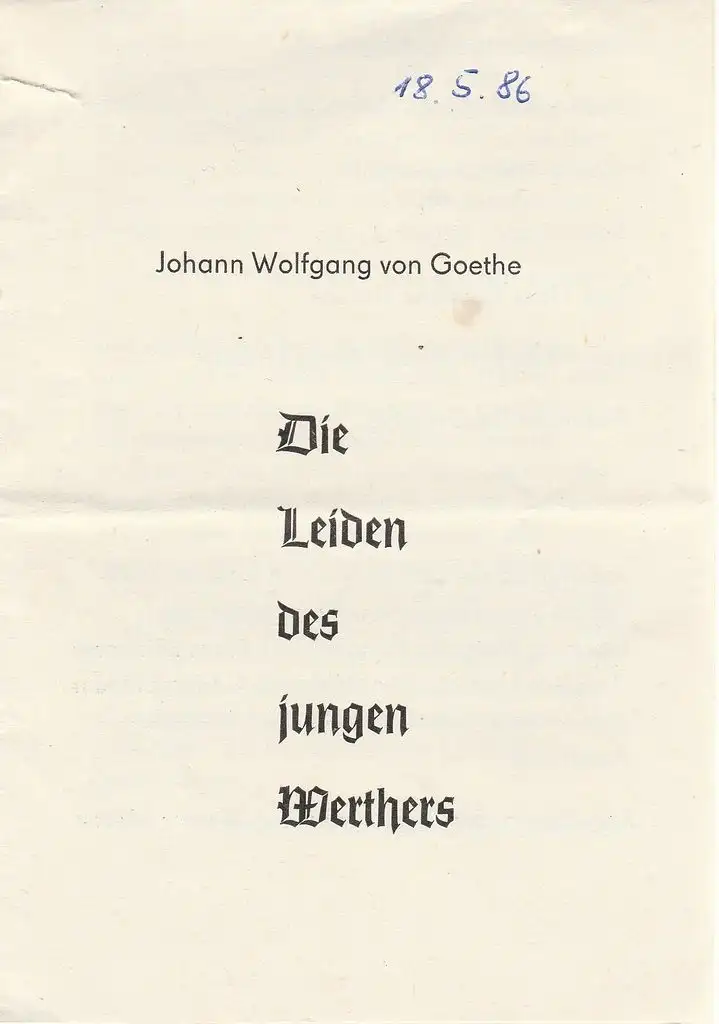 Titel: Programmheft Johann Wolfgang von Goethe DIE LEIDEN DES JUNGEN WERTHERS Premiere 28. März 1986 Spielzeit 1985 / 86 Nr. 9