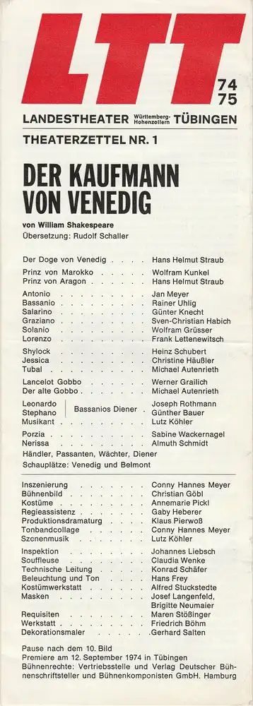 Landestheater Württemberg-Hohenzollern, Manfred Beilharz, Heiner Mey, Klaus Pierwoß, Wolfgang Spielvogel: Programmheft William Shakespeare DER KAUFMANN VON VENEDIG Premiere 12. September 1974 Tübingen Spielzeit 1974 / 75 Theaterzettel Nr. 1.