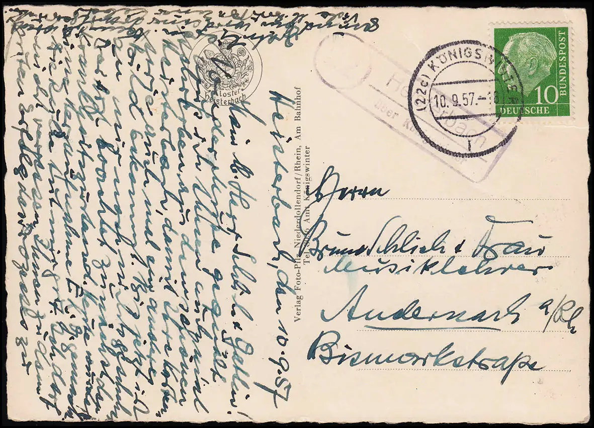 Landpost 22 Heisterbach über KÖNIGSWINTER 10.9.57 AK "Der Mönch von Heisterbach"
